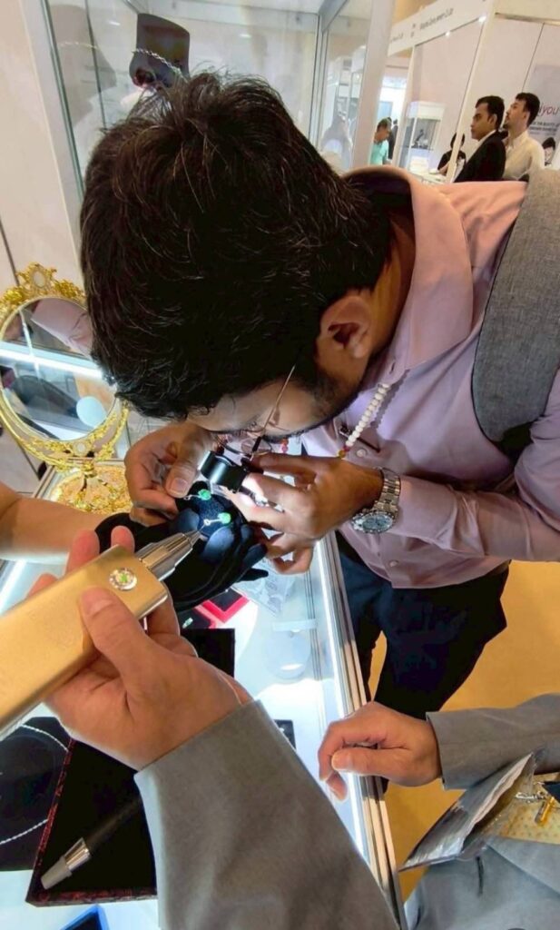 2025.11 外國專業鑑定師在攤位駐足良久,還用放大鏡專心鑑賞實驗室翡翠